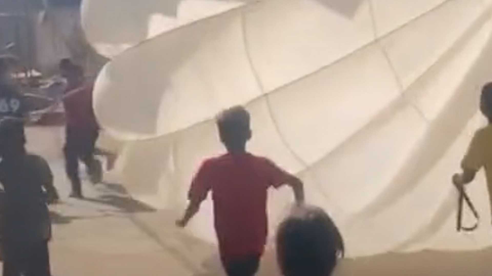 Children in Gaza play games with aid drop parachute